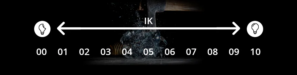 Die IK-Schutzklasse zeigt die Schlagfestigkeit einer Leuchte sowie den Schutz vor Vandalismus an. Sie wird in zwei Ziffern ausgedrückt (IK00 - IK10). Produkte mit IK00 sind somit nicht geschützt gegen Schläge oder Stöße jeglicher Art. Produkte mit IK10 bieten Schutz gegen Stöße von 20 Joule und sind gegen vandalismus-sicher.